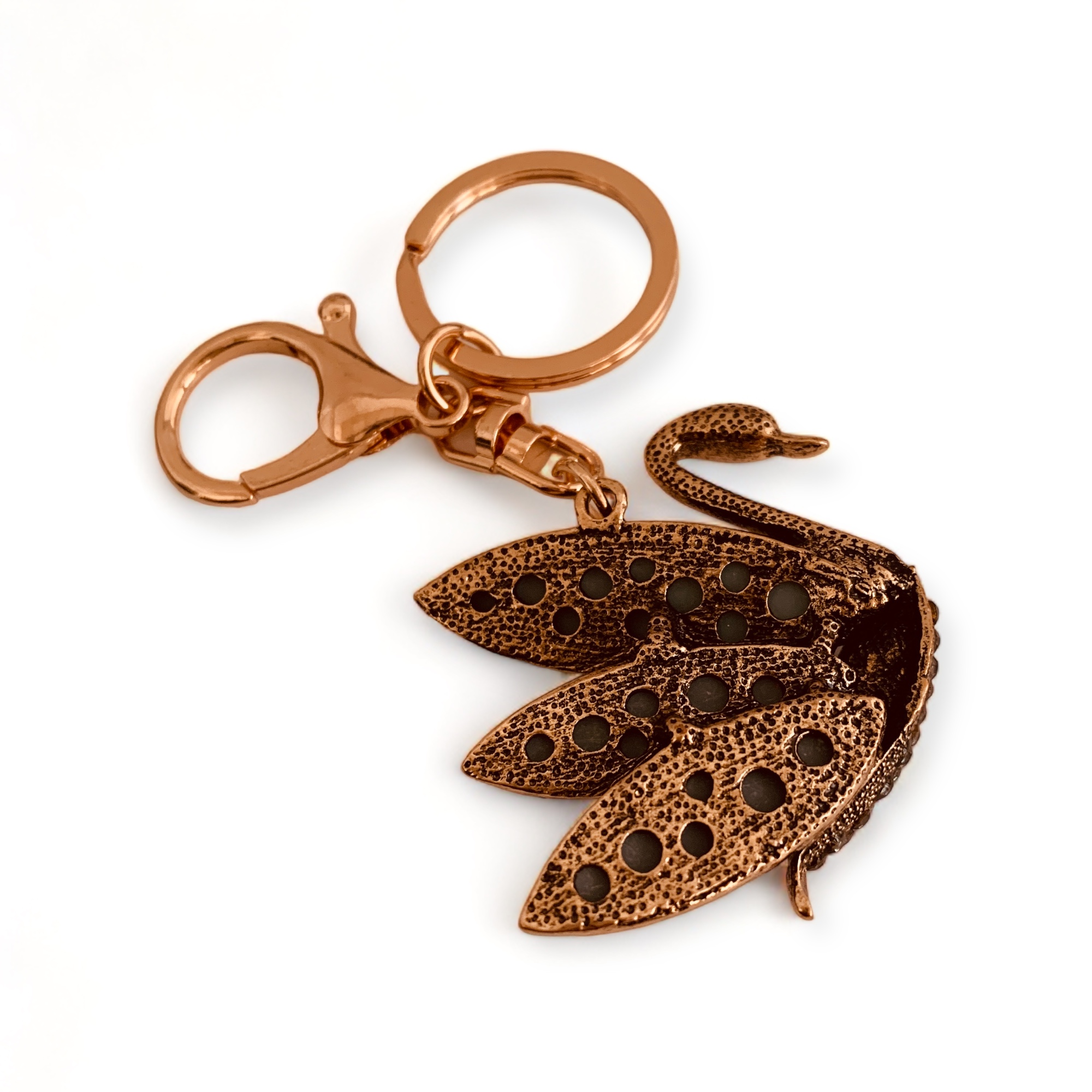 С дълготрайна и здрава закопчалка, този ключодържател ‘Розовозлатен Лебед’ е идеален за прикрепяне към вашите ключове, чанта или други лични вещи.