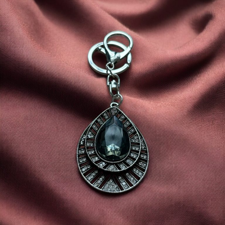 Този изискан ключодържател с форма на капка е украсен с впечатляващ черен кристал и нежни инкрустации от блестящи камъни. Съчетавайки елегантност и стил, той е подходящ аксесоар както за ключове, така и за чанти. Дизайнът му излъчва загадъчност и класа, което го прави перфектен подарък за специален човек или луксозно допълнение към вашия личен стил.